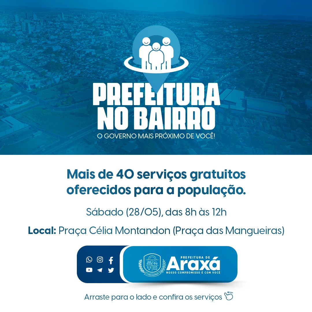 Emissão da 1ª via de identidade, vacinação contra a Covid e de rotina, acesso a programas sociais, orientação para a abertura de empresas, atividades esportivas e muitos outros projetos desenvolvidos pela Prefeitura de Araxá. Os moradores do Setor Leste de Araxá vão receber a 3ª edição do programa Prefeitura no Bairro. O evento acontece no próximo sábado (28), das 8h às 12h, na Praça Célia Montandon (Praça das Mangueiras). O local, que possui estrutura para realização de atividades físicas e fechamento do entorno para oferecer mais conforto e segurança, vai disponibilizar mais de 40 serviços gratuitos à população.
