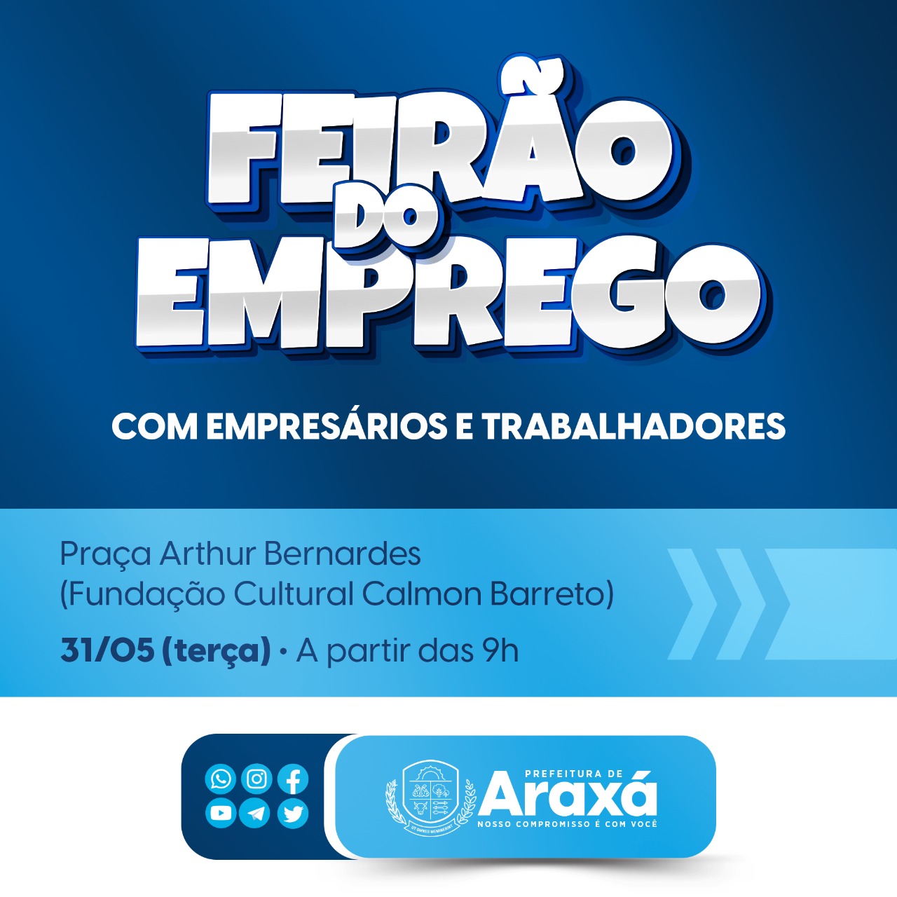 A Prefeitura de Araxá promove o Feirão do Emprego, nesta terça-feira (31), a partir das 9h, na Praça Arthur Bernardes, em frente à Fundação Cultural Calmon Barreto. O evento é organizado pela Secretaria Municipal de Desenvolvimento Econômico, Inovação e Turismo, por meio do Sistema Nacional de Emprego (Sine) de Araxá.