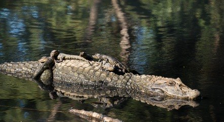 Uma fêmea de jacaré foi vista com 11 filhotes, nesta semana, na lagoa da Pampulha, em Belo Horizonte. O registro foi feito pelo biólogo e fotógrafo Pedro Henrique Tunes e viralizou nas redes sociais.