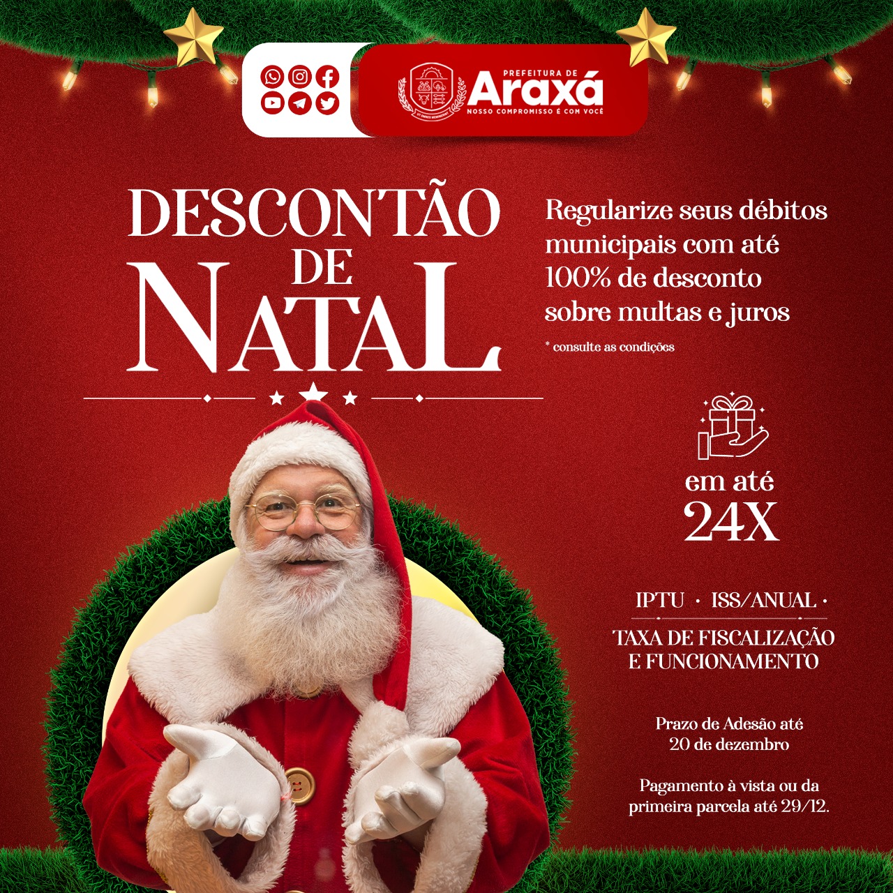 Um presente de fim de ano para quem deseja quitar seus débitos com o Município. A Prefeitura de Araxá lança, a partir desta sexta-feira (9), o Programa de Regularização Fiscal com desconto de até 100% da multa e dos juros devidos. O Imposto Predial e Territorial Urbano (IPTU), o Imposto sobre o Serviço Anual (ISS/Anual) e as Taxas de Fiscalização e Funcionamento vencidos até 31 de dezembro de 2021 poderão ser negociados pelo contribuinte.