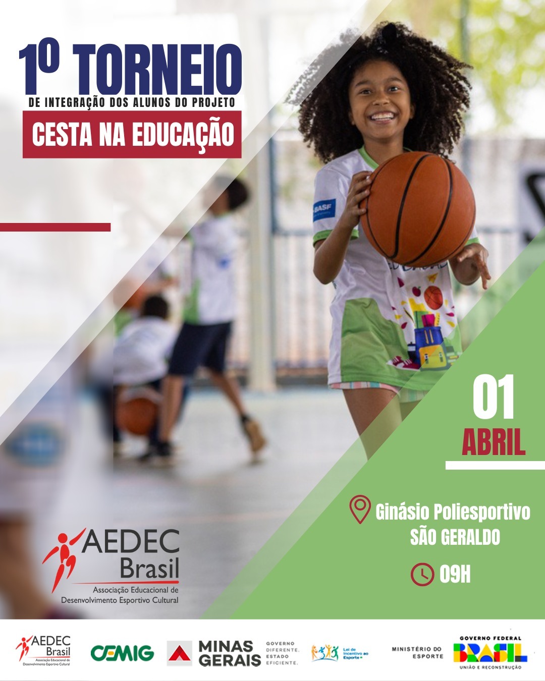 Vem aí o 1º torneio de integração dos alunos do Projeto Cesta na Educação Araxá! A AEDEC Brasil e a CEMIG convidam a comunidade, os familiares e os amantes do basquete para esse grande evento, que será realizado no ginásio Poliesportivo João Elmiro Manoel, do bairro São Geraldo, situado na avenida Amazonas 271, no dia 01 de abril de 2023.