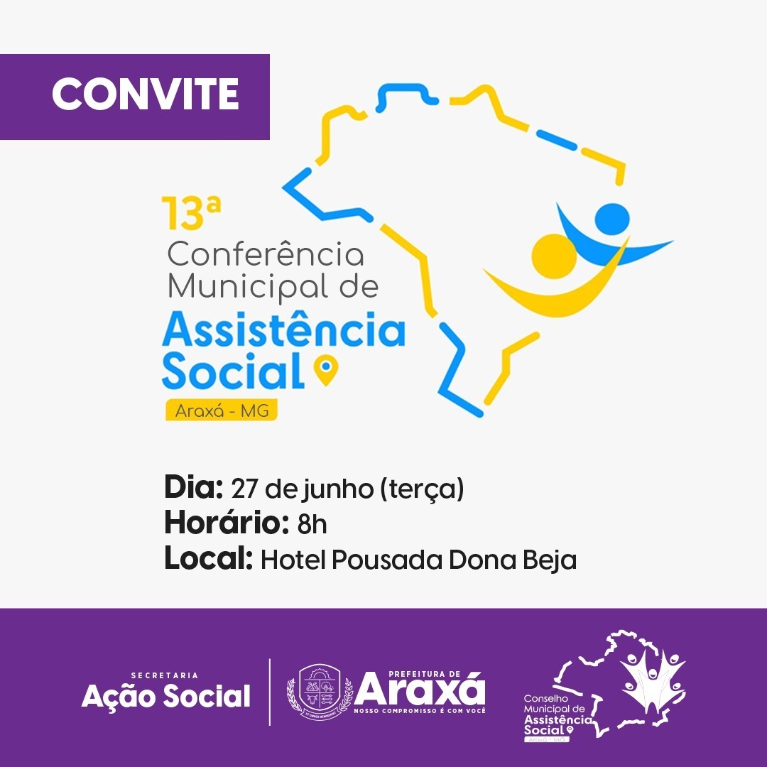 Na oportunidade, também serão escolhidos os delegados que deverão representar Araxá na Conferência Estadual. A partir da convocação conjunta do Ministério do Desenvolvimento e Assistência Social, Família e Combate à Fome e do Conselho Nacional de Assistência Social (CNAS), se dá a continuidade da organização deste Processo Conferencial, que será concluída com a 13ª Conferência Nacional de Assistência, prevista para acontecer de 5 a 8 de dezembro, em Brasília.