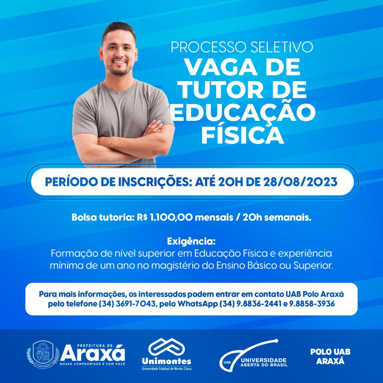 O Polo da Universidade Aberta (UAB) de Araxá está com processo seletivo simplificado aberto para vaga de tutor presencial em Educação Física. As inscrições devem ser realizadas por meio do endereço eletrônico ( https://tinyurl.com/mwsasb2c ) e se encerram nesta segunda-feira, 28 de agosto, às 20h.