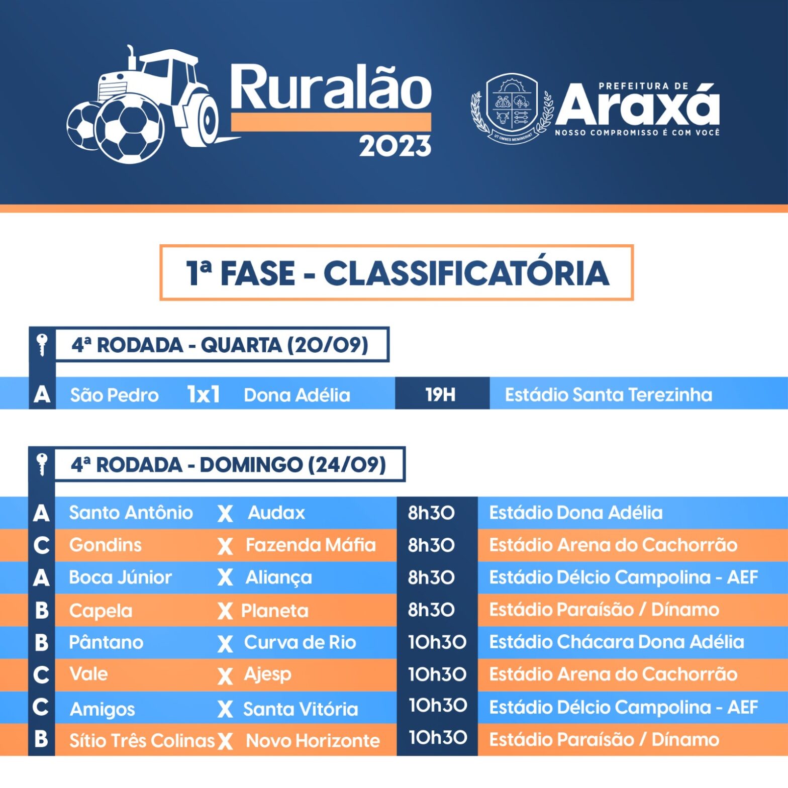 A 4ª rodada do 30º Campeonato Ruralão teve início na quarta-feira (20) com o jogo entre Dona Adélia e São Pedro, que empataram por 1 a 1. Mais oito partidas complementam a rodada e acontecem neste domingo (24), em quatro praças esportivas.
