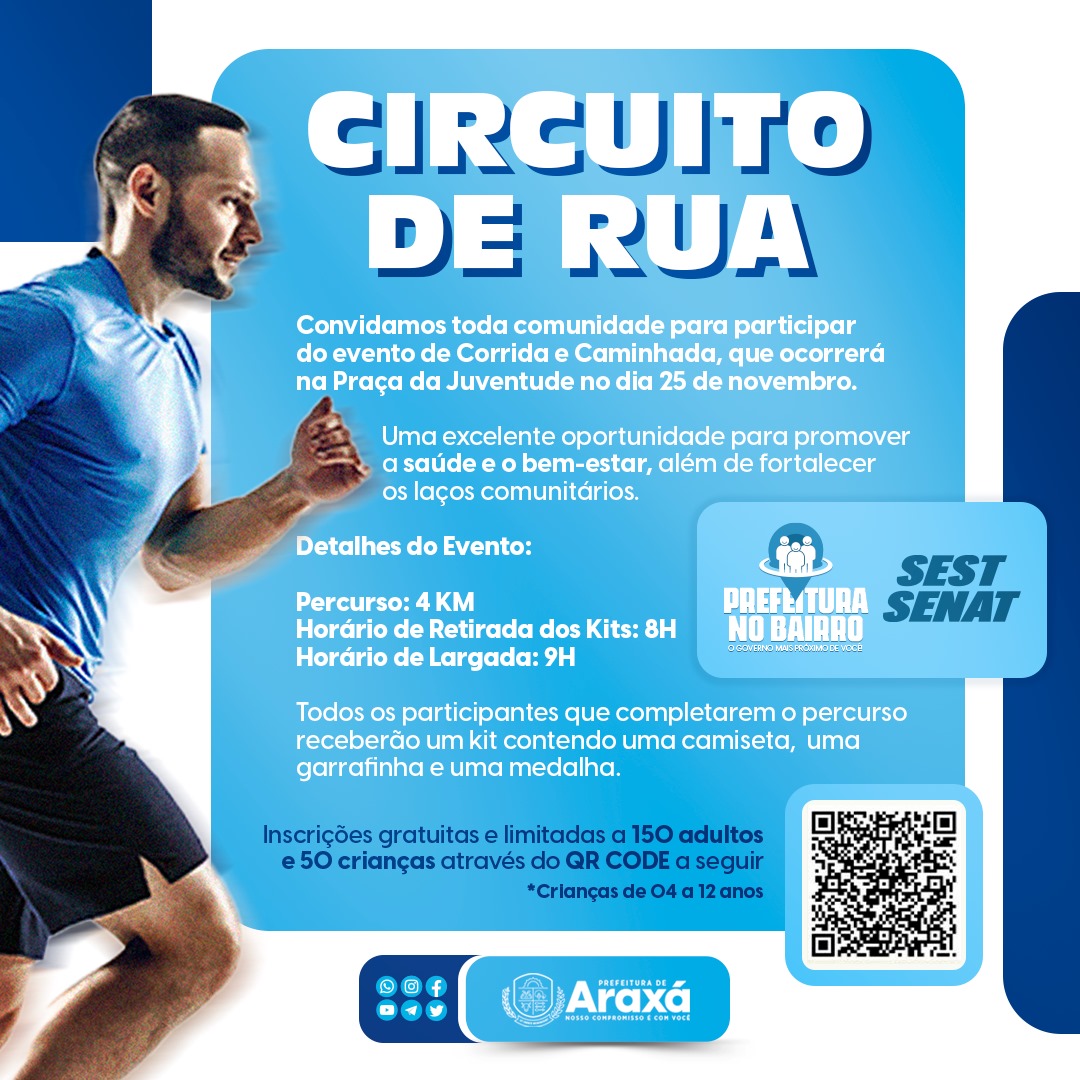 A Prefeitura de Araxá e o Serviço Social do Transporte e Serviço Nacional de Aprendizagem do Transporte (Sest Senat) vão promover o Circuito de Rua, no sábado (25), durante a 18ª edição do projeto Prefeitura no Bairro, na Praça da Juventude.