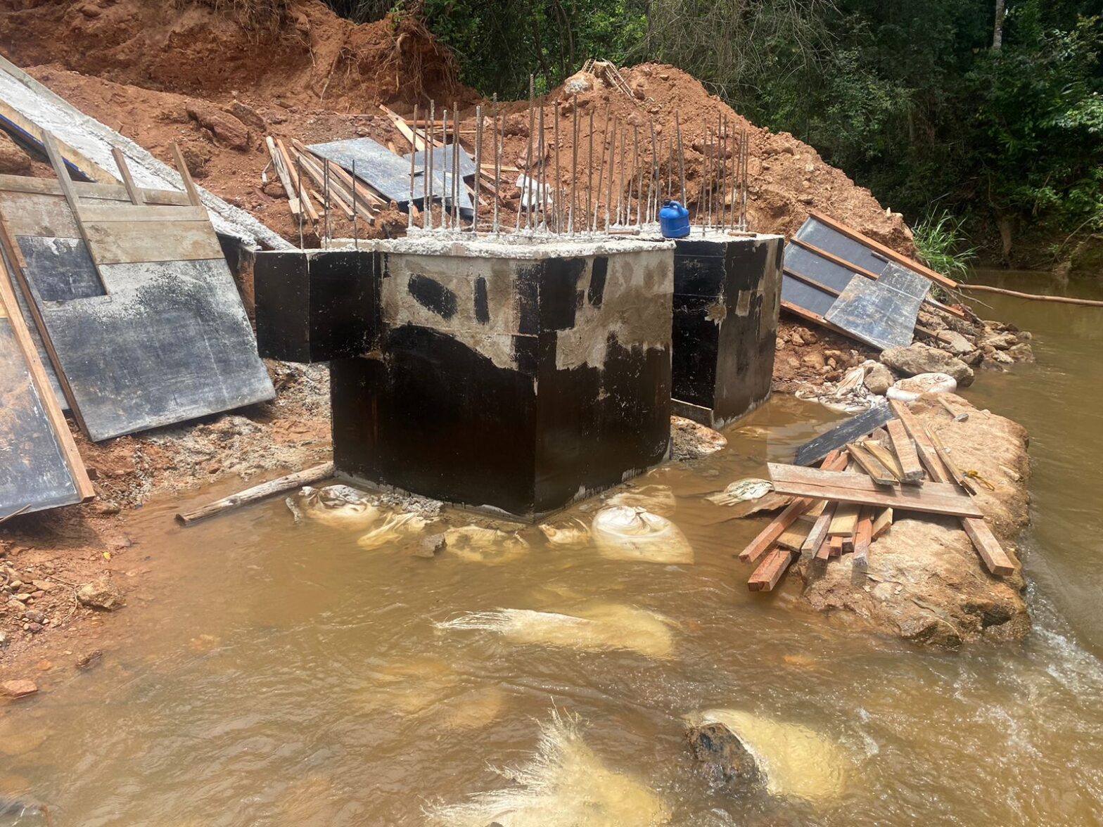A obra da nova ponte sobre o Ribeirão Pirapetinga está na fase de construção da estrutura de sustentação com concretagem e ferragens.